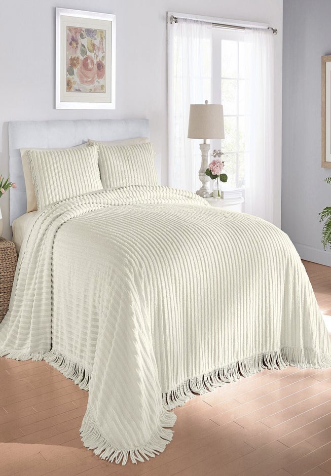 Make your bed inviting with this oversized, soft chenille bedspread in a fresh palette of colors. Fringe trims the edge for added length and detail.