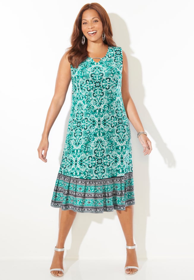 FIT: Shift dress silhouette fall straight from shoulder to hem. Sleeveless pullover style. Scoop neckline with flirty keyhole. Bust darts for shaping. 7" flounce at the hem.