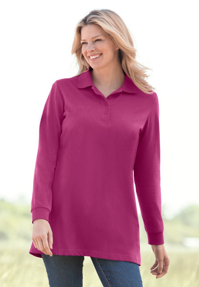 This roomy polo knit is a cute choice for relaxed comfort and breathable ease. Ribbed cuffs allow you to push the sleeves up for a casual look, or wear them down, and a four-button placket with collar stays in line with the classic polo look. Made in our most-loved tunic length.