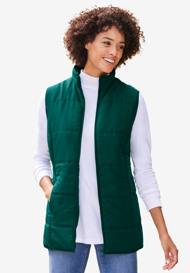 This quilted vest will have you in love with layering. A stand collar and zip front keeps you nice and cozy while princess seams create a flattering shape that is still relaxed. Throw this on over your classic tees for an extra touch of warmth.