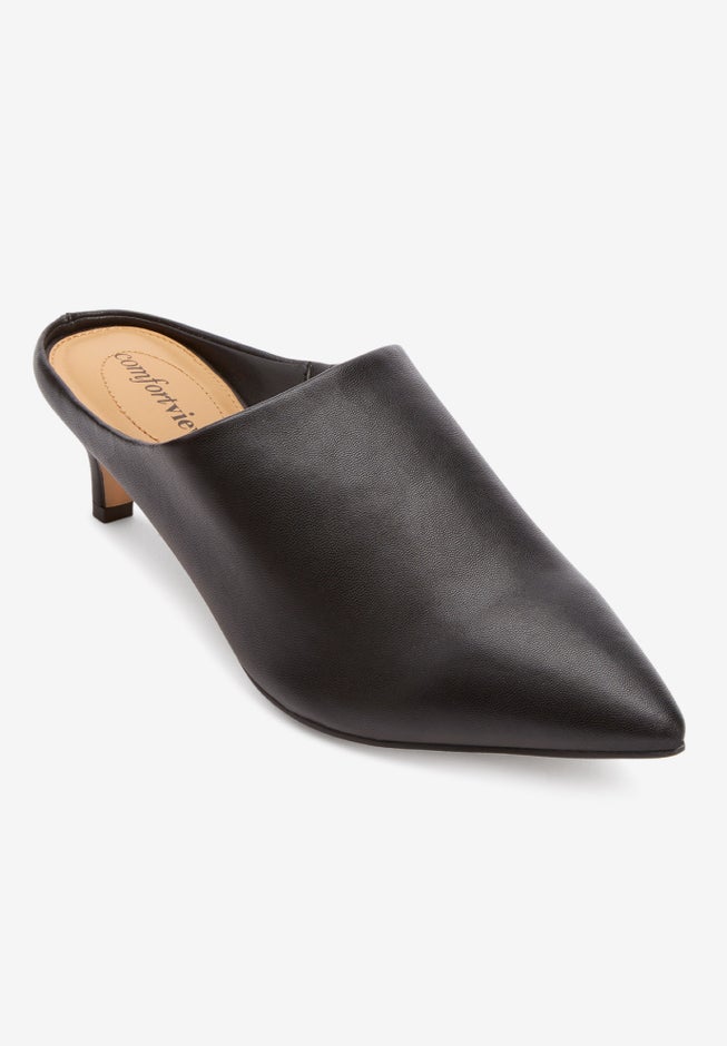Leather-like mules available in full and half sizes 7-11, 12 M; 7-11, 12 W; 7-11, 12 WW