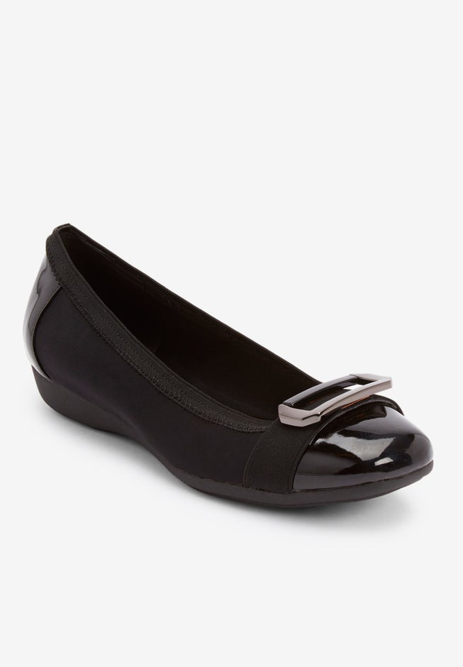 A square toe flat with patent-leather-like cap these London flats will add bold sophistication to any look.